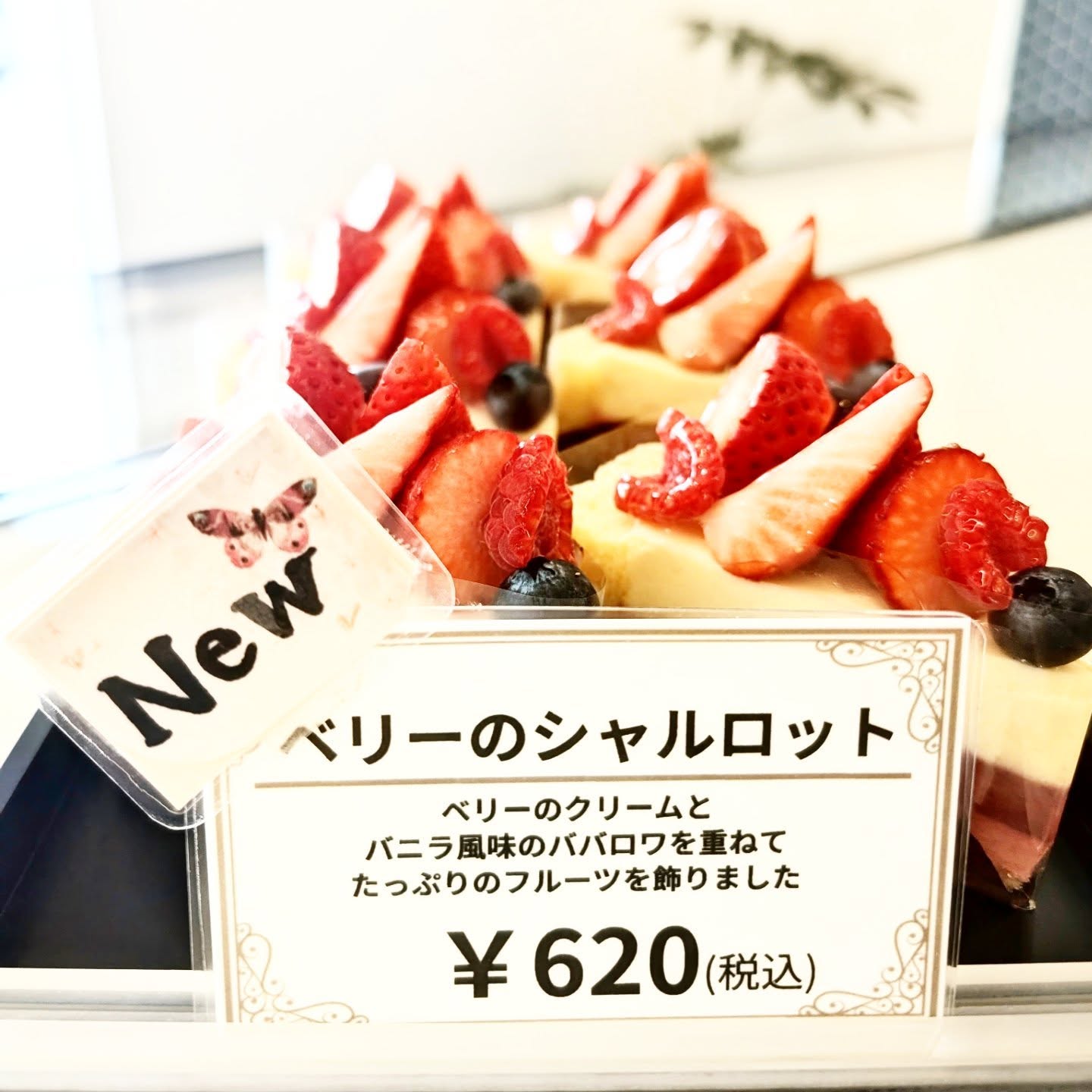 バニラ風味のババロワと、ベリーのクリームの上にベリー系のフルーツを沢山乗せたケーキになっております🍓🫐